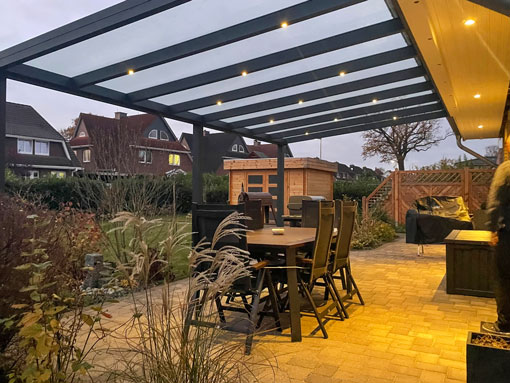 - Perfekte Integration: Die Beleuchtungselemente verschmelzen nahtlos mit Ihrem Terrassendach und bilden eine harmonische Einheit.
